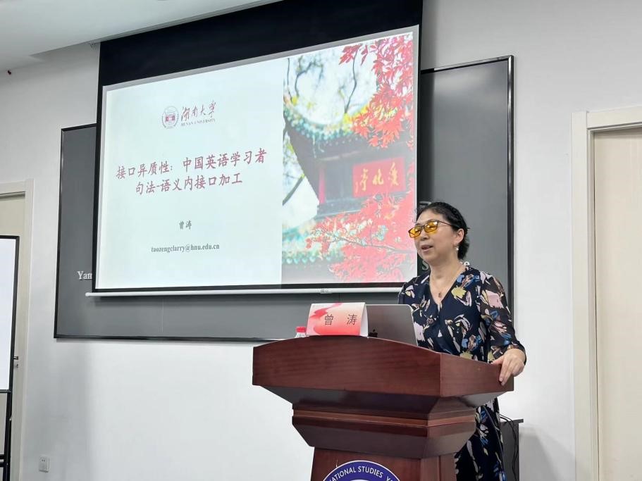 首先,曾涛教授从研究背景、研究内容、中动结构、增元结构以及接口异质性五方面介绍了湖南大学认知科学研究所在中国英语学习者句法-语义内接口加工领域多年的研究脉络、研究设计沿革、国内外合作项目以及国内外发表的重大研究成果。