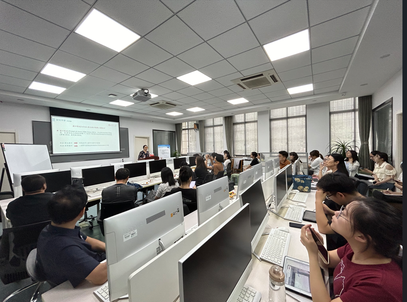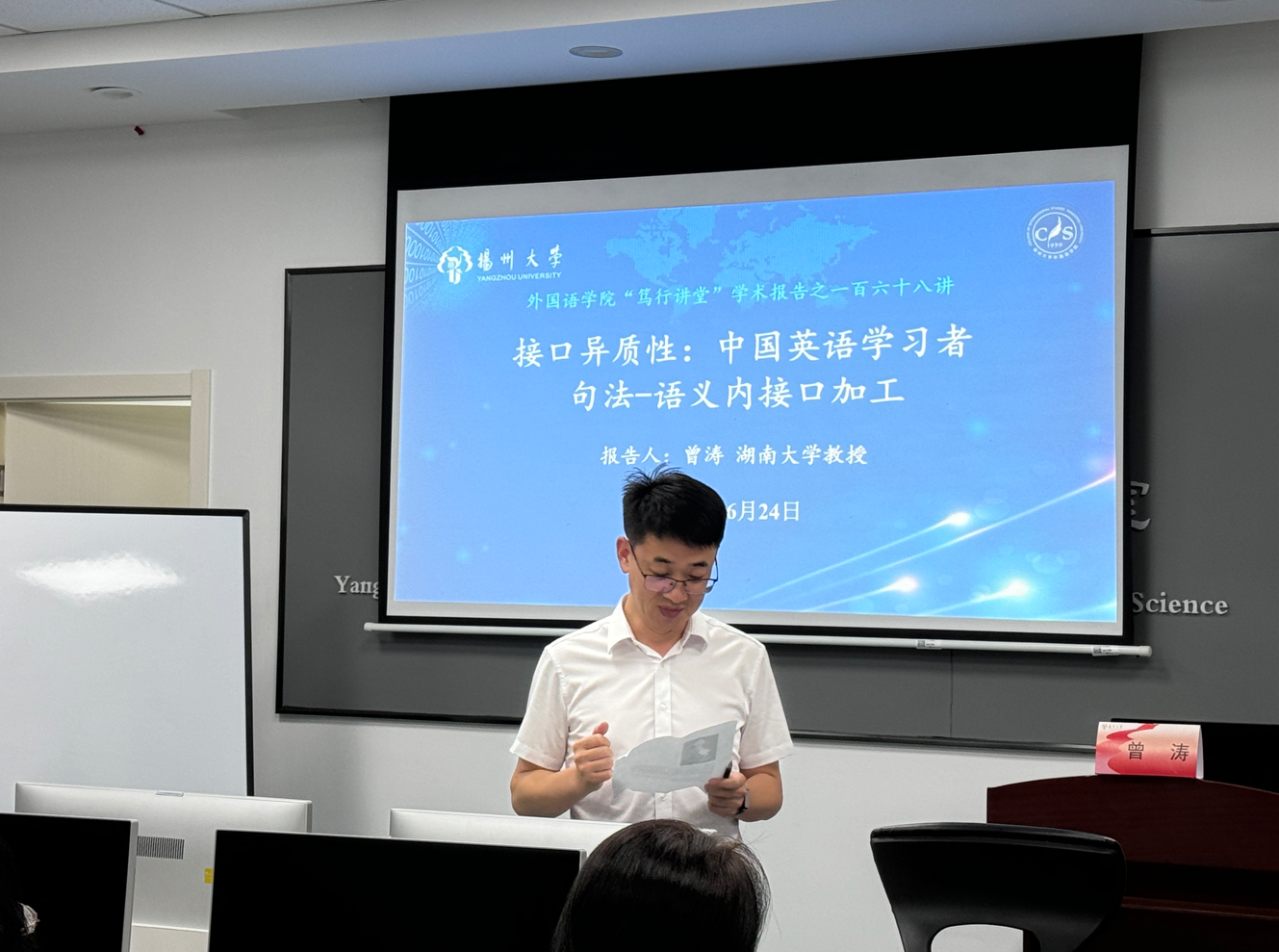 6月24日下午,湖南大学认知科学研究所所长、博士生导师曾涛教授应邀来我院做题为“接口异质性:中国英语学习者句法-语义内接口加工”的学术报告。报告在我院语音-听觉-认知科学实验室举行,由何山华院长主持,我院从事认知科学研究和认知教学研究的师生40余人参加了本次专题学术报告。
