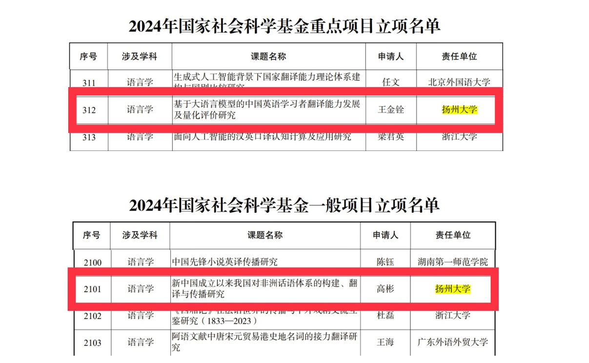 9月14日,全国哲学社会科学工作办公室公布了2024年国家社科基金年度项目立项结果。我院两名教师申报的课题获得立项资助,王金铨教授申报的“基于大语言模型的中国英语学习者翻译能力发展及量化评价研究”获批国家社科基金重点项目,特聘教授高彬老师申报的“新中国成立以来我国对非洲话语体系的构建、翻译与传播研究”获批国家社科基金一般项目。近年来,我院已连续获得国家社科基金项目立项42项。