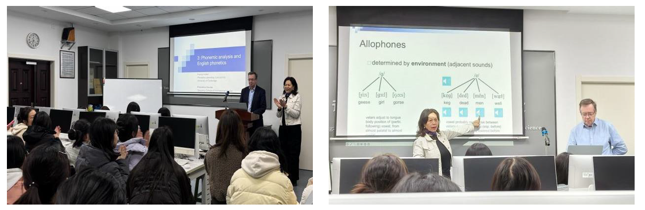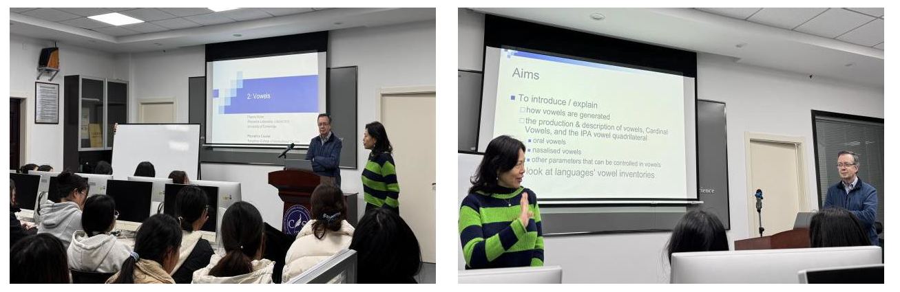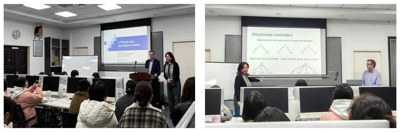 在AI智能与数智教育时代,语音数据至关重要。语音科学是研究人类言语声音的物理、生理和心理等具象本质的科学,与话语产出和语意表达息息相关,与基础教育阶段的英语课堂教学、大学生综合口语能力提升、研究生教学研究思路拓展、智能语言服务社会民生等核心领域更是密不可分。近年来心理语言学、脑神经科学等前沿学科成果证明,语音是人类心智的直接表征和脑机接口的直接通道。作为剑桥大学国际精品课程群《语音科学》的基础课程,《普通语音学》从发音语音学、声学语音学、感知语音学三大体系讲述当代语音科学的理论基础、声学表征、研究范式、技术路径以及国际视域下的二语教学应用,内容涵盖英语音段、节奏、韵律、语调、自然语言加工、跨学科应用研究等领域,是一门集理论、方法、技术、教学和应用于一体的语音科学入门课程。本院研一、研二学硕、专硕研究生和部分本科生共六十余人参加了本次国际联合课程的研修。课程信息量大,涉及面广,学理层级丰富,应用领域广阔,具有鲜明的跨语言、跨学科、重基础、重应用的特色。Nolan教授的讲授严谨缜密、儒雅风趣,周卫京教授的讲解朴实简约、活泼灵动,彼此相得益彰,深入浅出,使每晚冒着严寒来修学的同学,总是兴致勃勃、受益多多,启迪满满,意犹未尽。