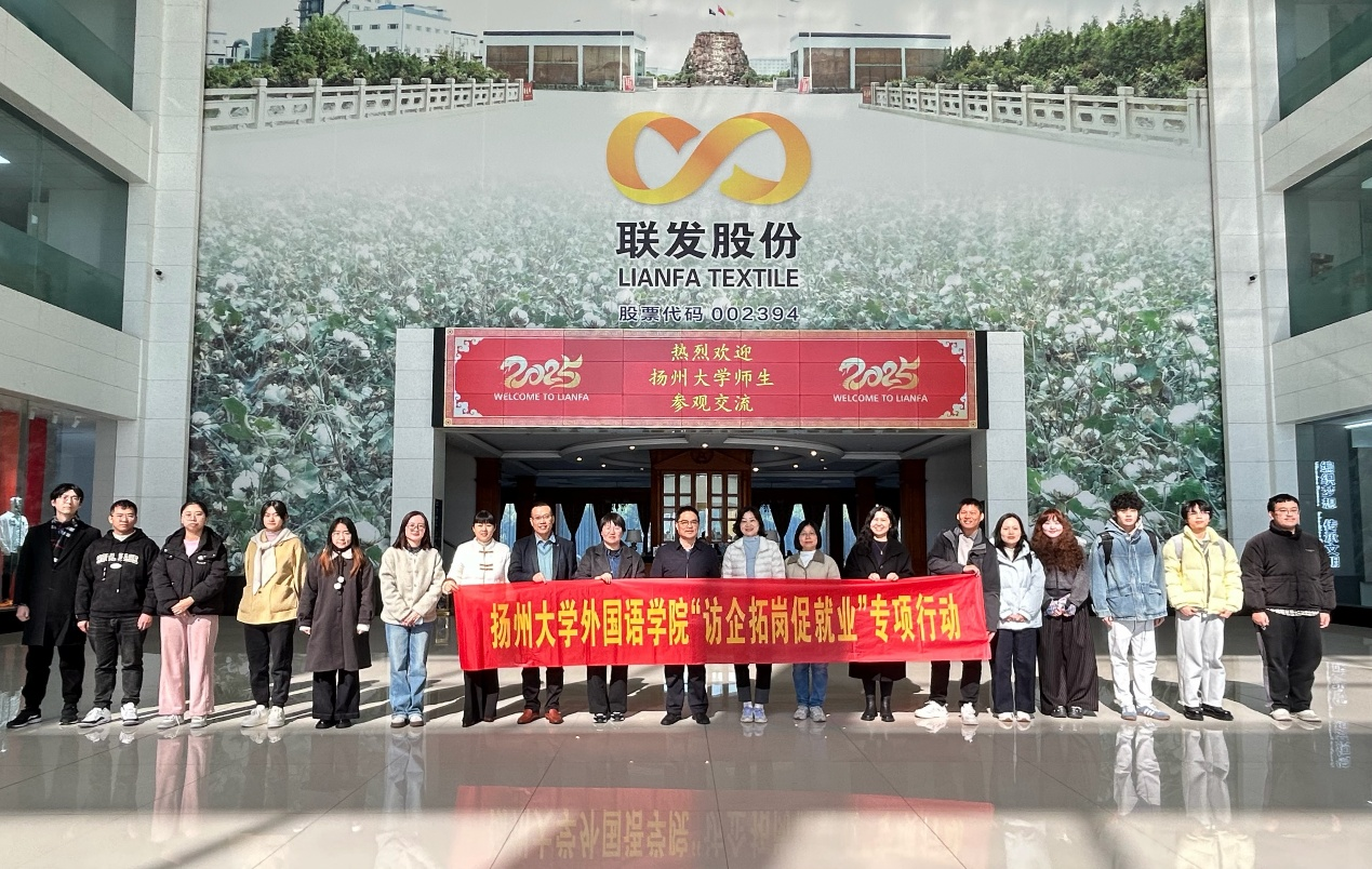 为深化校企合作,推进产教融合,助力学生高质量就业,11月18日,学院党委书记居学明和院长助理高彬率队赴江苏联发纺织股份有限公司参观交流,开展“访企拓岗促就业”专项行动。阿拉伯语系专业教师林羽倩、古萍,辅导员王昊,以及阿拉伯语、西班牙语、商务英语和翻译等专业学生代表,共28人参加活动。