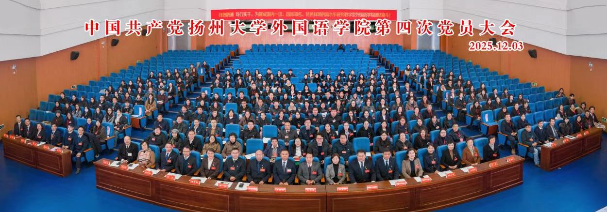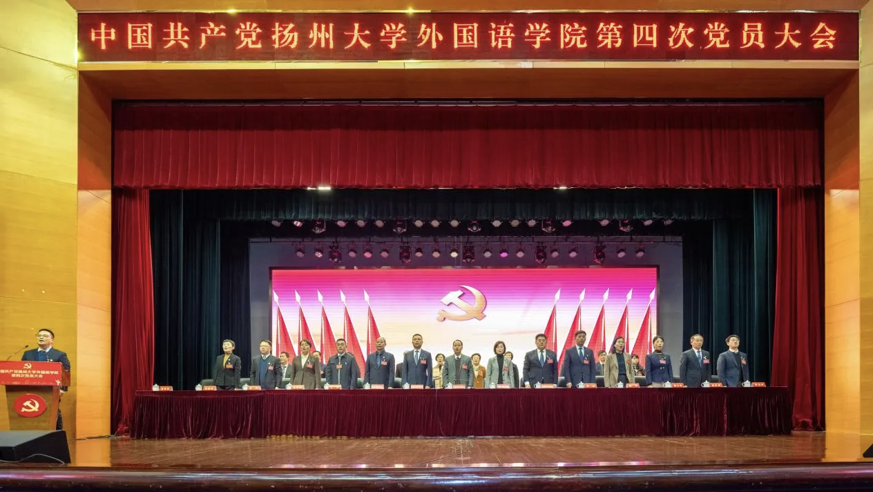 2025年12月3日,中国共产党扬州大学外国语学院第四次党员大会在扬子津校区文体馆三楼报告厅隆重召开。校党委常委、副校长王承堂出席大会并讲话,机关党委书记、组织部副部长蔡丽娅、部分兄弟学院党委书记、学院老领导、党外代表人士出席会议,师生党员186人参加大会。