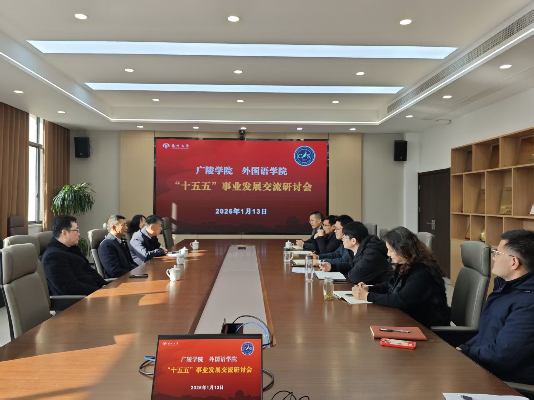 1月13日上午,扬州大学广陵学院院长严长杰、党委书记孟益宏、党委副书记费拥军、副院长程海霞一行到访我院,就深化两院教学合作、促进协同发展开展交流研讨。外国语学院党委书记居学明,院长何山华,党委副书记王晖,副院长张强、问筱平,党委委员高彬、综合办公室副主任刘语颂参加会议。