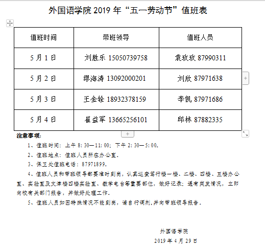 外国语学院2019年“五一劳动节”值班表