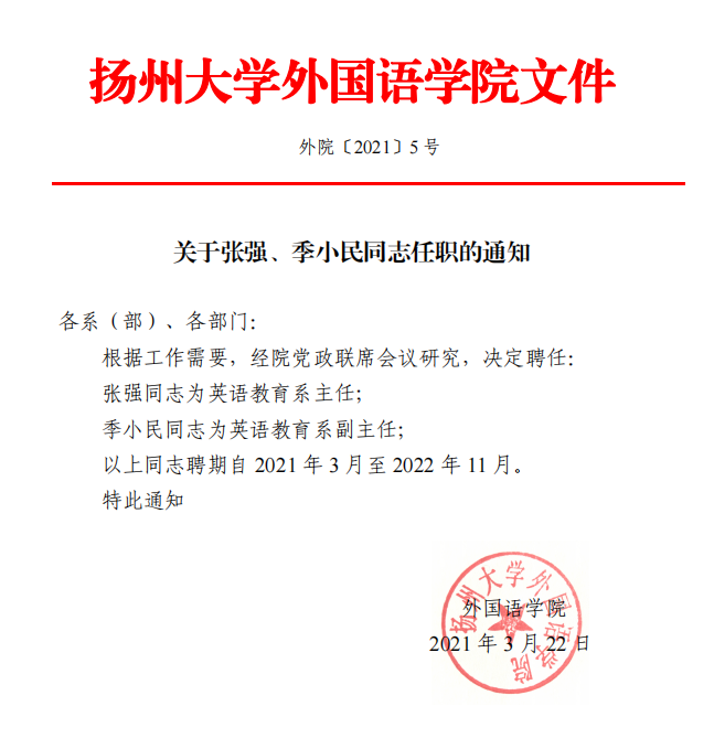 关于张强、季小民同志任职的通知
