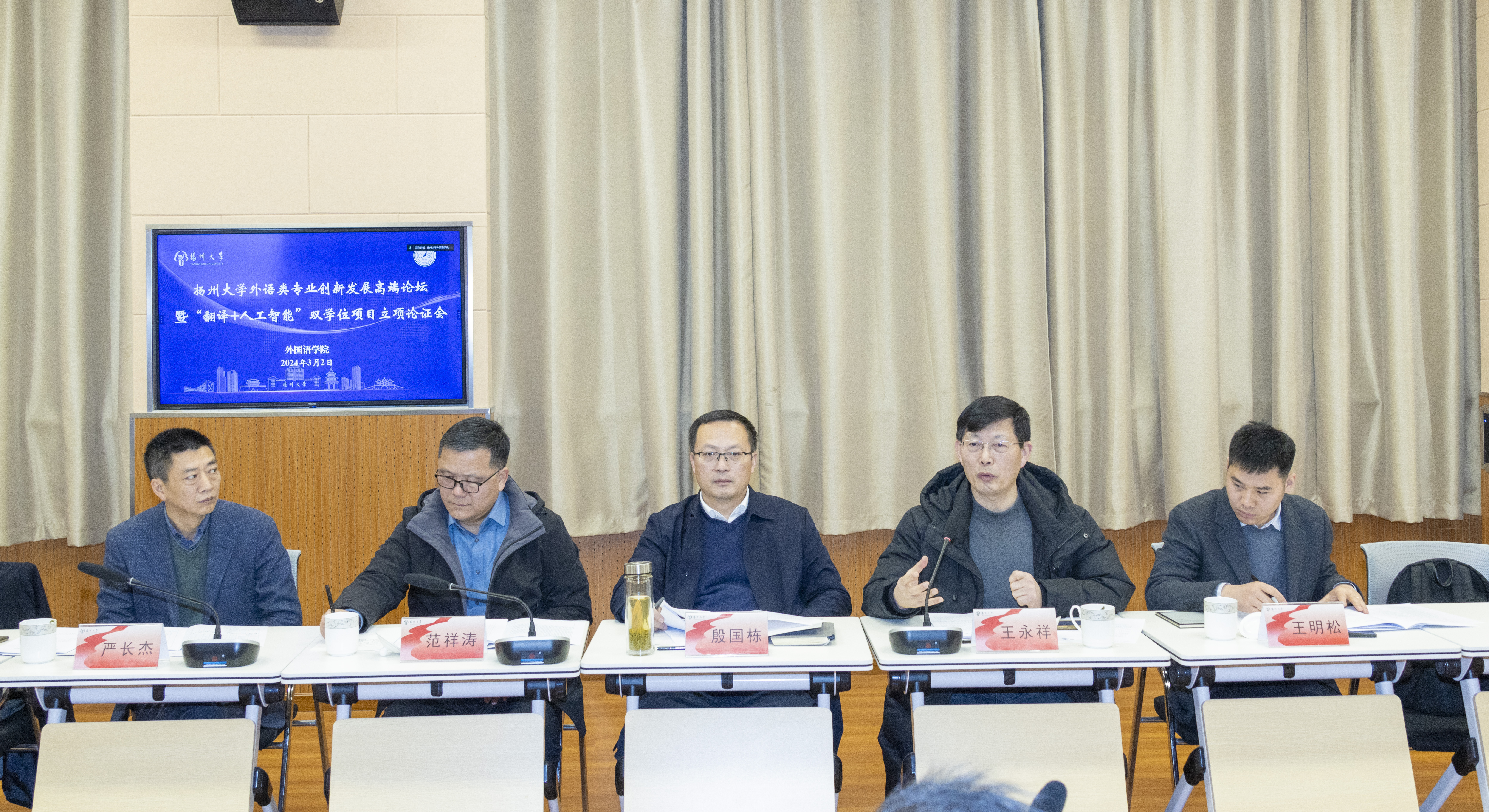 2024年3月2日,扬州大学外语类专业创新发展高端论坛暨“翻译+人工智能”双学士学位复合型人才培养项目立项论证会在扬子津校区文津楼N409召开。东南大学教务处处长殷国栋、南京航空航天大学研究生院院长陈兵、南京航空航天大学外国语学院院长范祥涛、南京师范大学外国语学院院长王永祥、科大讯飞股份有限公司江苏区高教行业总监王明松、扬州大学教务处处长严长杰等作为项目论证专家出席论坛,我校外国语言文学学科带头人俞洪亮,人文社科处处长王金铨、信息工程学院(人工智能学院)院长孙小兵、外国语学院领导班子全体成员以及翻译、人工智能专业教师代表参加论坛。与会代表就学科专业优化调整,新文科、新工科建设,以及外语类专业在新形势下创新发展等问题展开热烈讨论。