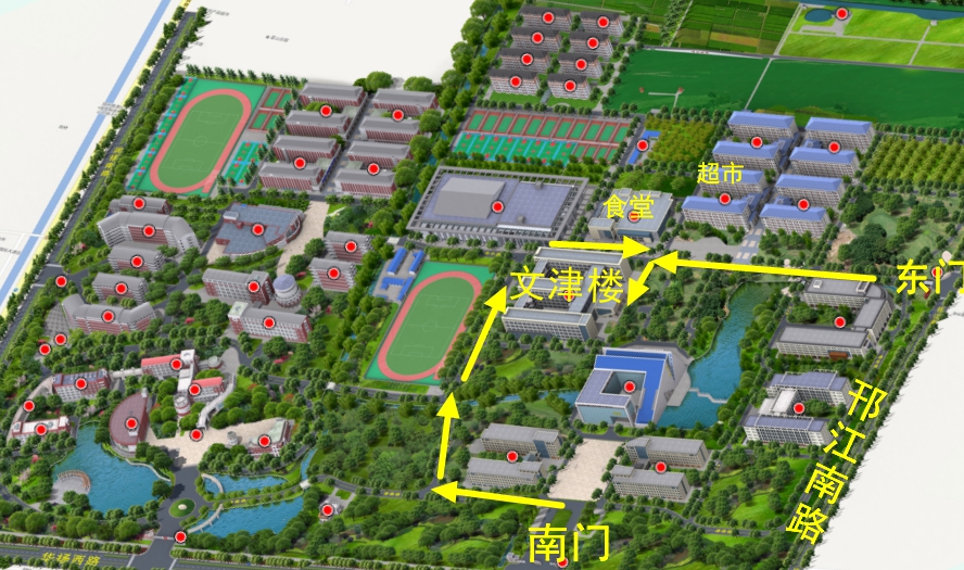 考生从扬子津校区东门(邗江南路)进入校园,进校后沿路直线100米即可抵达文津楼,该路线便捷且标识清晰。